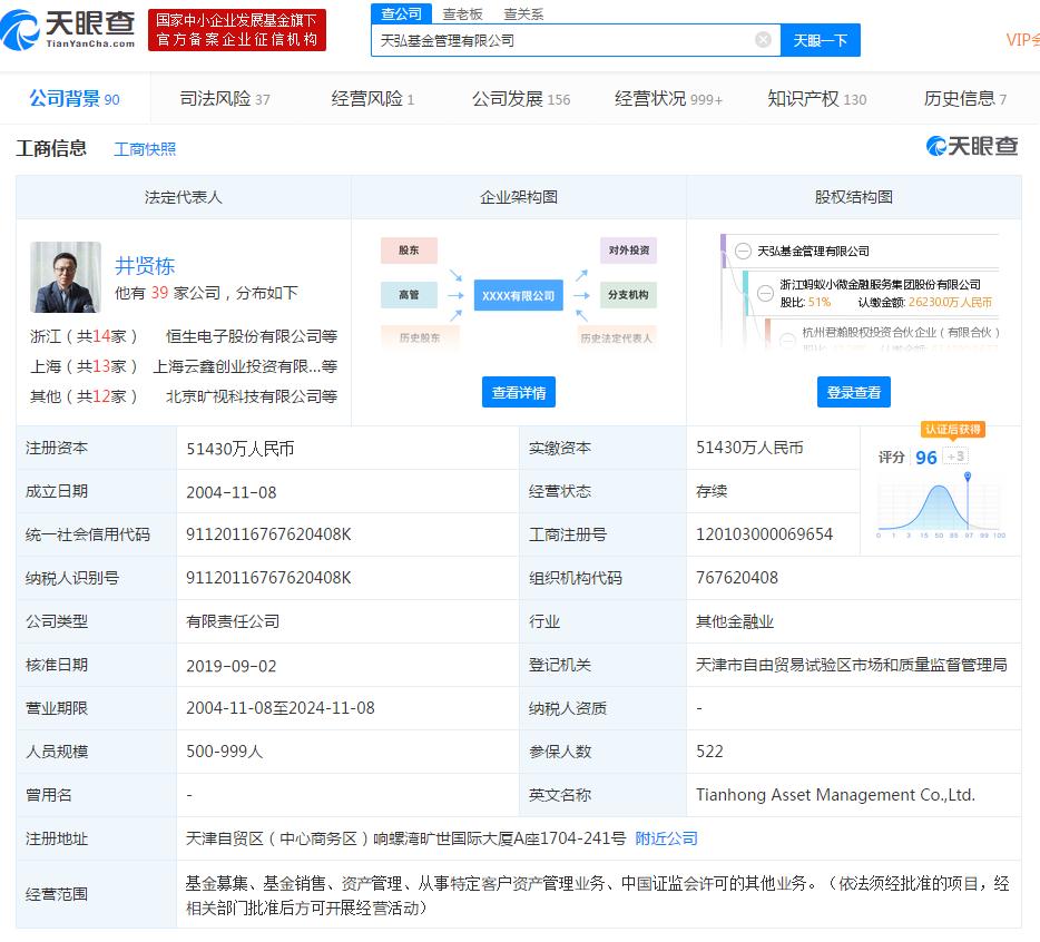 天眼查数据显示,天弘基金管理有限公司成立于2004年11月,注册资本约5.1亿元人民币,经营范围包括基金募集、基金销售、资产管理等,法定代表人为蚂蚁金服董事长兼CEO井贤栋。该公司的最大股东为浙江蚂蚁小微金融服务集团股份有限公司,持股比例为51.00%,第二股东为天津信托有限责任公司,持股比例16.80%,第三大股东为A股上市公司内蒙古君正能源化工集团股份有限公司,持股比例15.60%。