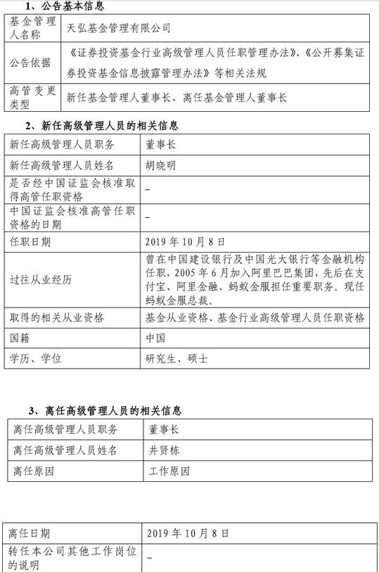 金融界基金10月15日讯 天弘基金发布高管变更的公告,由于工作原因,井贤栋离任董事长一职,由胡晓明补位。资料显示,胡晓明曾在中国建设银行及中国光大银行(行情601818,诊股)等金融机构任职,2005 年 6 月加入阿里巴巴集团,先后在支付宝、阿里金融、蚂蚁金服担任重要职务。现任蚂蚁金服总裁。